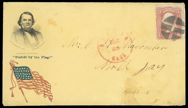 (1860 Campaign) Stephen A. Douglas, portrait facing right campaign design with additional red and blue flag patriotic design with "Stand by the Flag" slogan on yellow cover bearing 3¢ rose (65) tied by segmented cork and partial red "Boston, Mass. Dec 23" cds to North Jay Me.; reduced slightly at right, edge wear, Very Fine and rare campaign patriotic design, ex-Bischel .