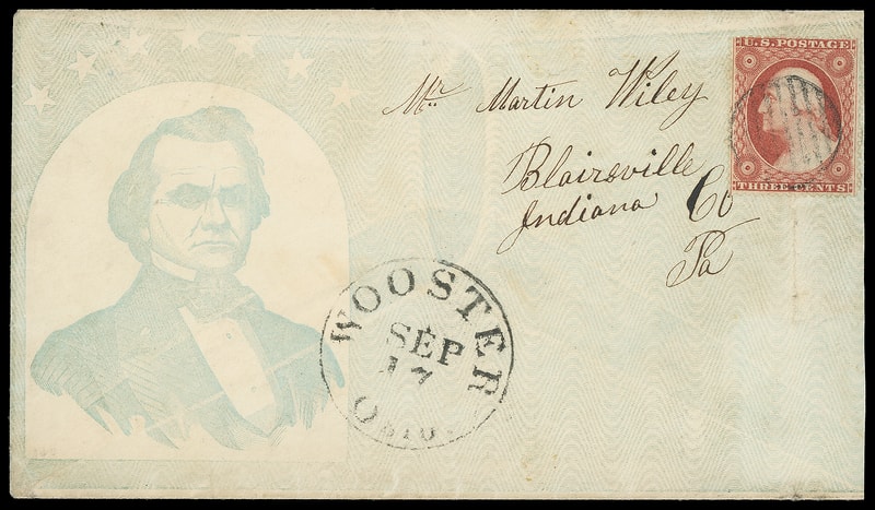 (1860 Campaign) Stephen A. Douglas, blue overall campaign design with portrait facing right, flap with "For President, S.A. Douglas, Vice President, H.V. Johnson" on cover bearing 3¢ dull red (26) just tied by grid cancel, matching "Wooster, Ohio. Sep 17" cds to Blairsville Pa.; slightly reduced at right, 3¢ barely affected from light vertical crease, Very Fine appearance, the only recorded example .