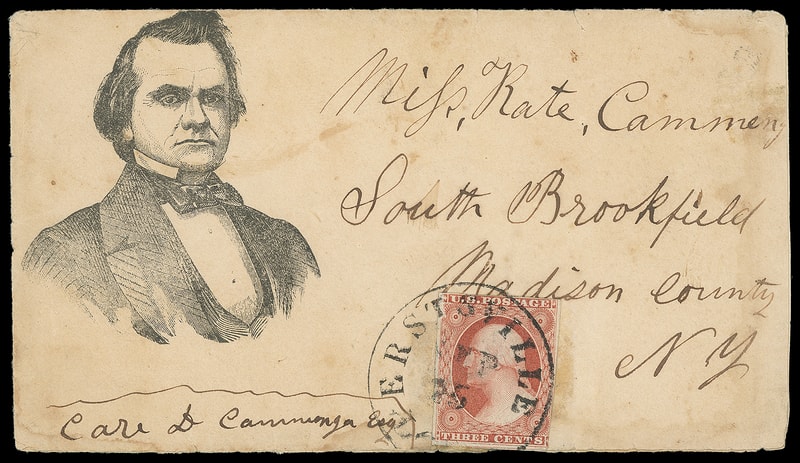 (1860 Campaign) Stephen A. Douglas, large portrait facing left on cover bearing 3¢ dull red (11A) tied by indstinct cds to South Brookfield, NY, rare design, light soiling, stamp probably replaced still, Fine appearing.