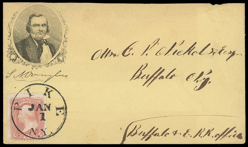 (1860 Campaign) Stephen A. Douglas, portrait in ornate frame campaign design with printed facsimile signature below on buff cover bearing 3¢ rose (65) s.e. at left, tied by bold "Pike N.Y. Jan 1" cds to Buffalo N.Y., manuscript directive "Buffalo & E. R.R. Office" at bottom right; reduced slightly at top with tiny edge tear, partial flap, expertly sealed small tear and partial backflap still, still Very Fine and rare design.