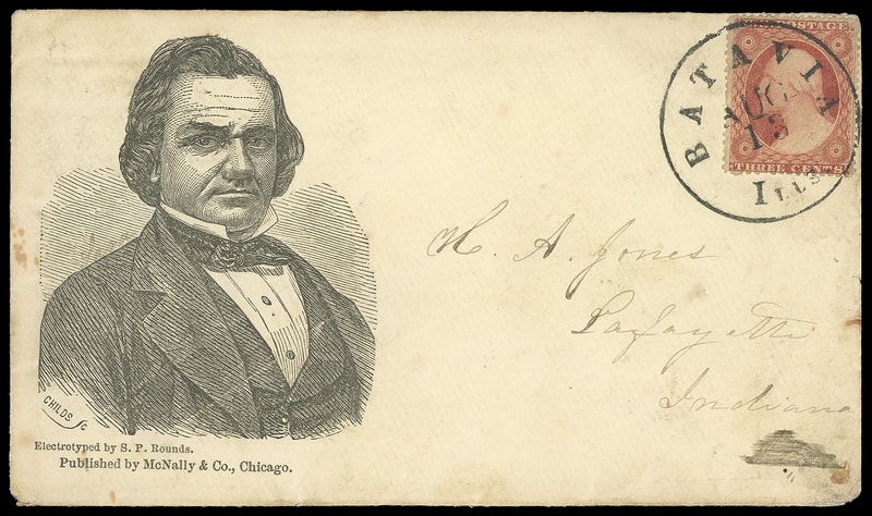 (1860 Campaign) Stephen A. Douglas, large portrait facing right campaign design with McNally & Co. imprint on light buff cover bearing 3¢ dull red (26) tied by "Batavia, Ill. Aug 13" cds to Lafayette Ind.; edge wear and small stain, F.-V.F. and very scarce campaign design.