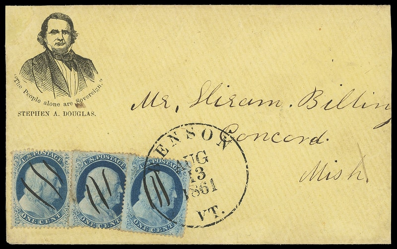 (1860 Campaign) Stephen A. Douglas, portrait facing left campaign design with verse "The People Alone are Sovereign, Stephen A. Douglas" below on yellow cover bearing three 1¢ blue (24) singles, overlapped and canceled by matching manuscript cancels, right tied by bold "Benson Vt. Aug 13, 1861" cds to Concord; top left corner repair, reduced a bit at right, F.-V.F. appearance, ex-Bischel .