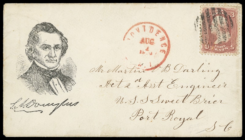 (1860 Campaign) Stephen A. Douglas, portrait facing right campaign design with facsimile "S.A. Douglas" signature below on cover bearing 3¢ rose (65) tied by large grid, red "Providence R.I. Aug 4" cds addressed to 2d Asst. Engineer, U.S.S. Sweet Brier, Port Royal S.C., Very Fine and choice, ex-Bischel .