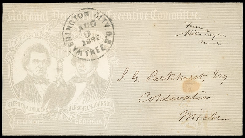 (1860 Campaign) Stephen A. Douglas, Herschel Johnson, gray overall illustrated campaign design with dual oval portraits of S. Douglas and H. Johnson for the "National Democratic Executive Committee", Mospedon & Baker imprint on flap of cover with Chairman "Miles Taylor, M.C." Congressional free frank and neat "Washington City 'Free' Aug 9, 1860" cds to Coldwater Ill.; stain spot, otherwise Very Fine and extremely scarce, ex-Landau .