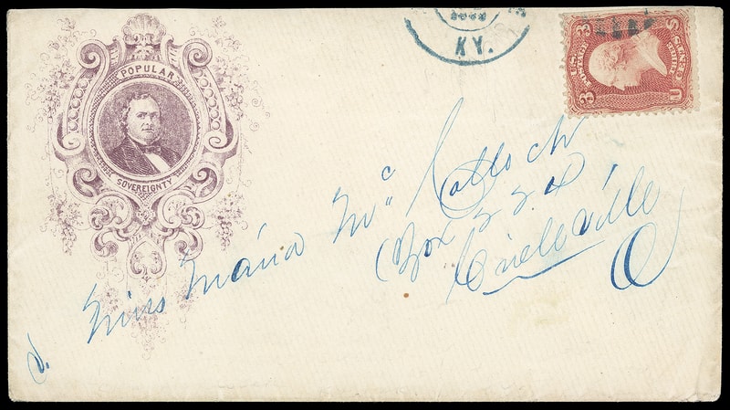 (1860 Campaign) Stephen A. Douglas, purple campaign design with circular portrait in fancy frame incorporating "Popular Sovereignty" slogan, on cover bearing 3¢ rose (65) nat. s.e., canceled by blue grid duplexed with partial Louisville Ky. cds to Circleville, Ohio; reduced slightly at top, Very Fine and attractive campaign design, the only recorded example .