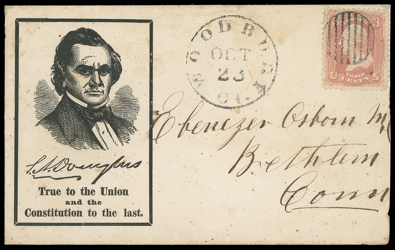 (1860 Campaign) Stephen A. Douglas, portrait compaign design in simple rectangular frame with printed signature and "True to the Union and the Constitution to the last" verse below on cover bearing 3¢ rose (65) canceled by circular grid, matching "Woodbury Ct. Oct 23" cds to Bethleham Conn.; reduced at right, F.-V.F.