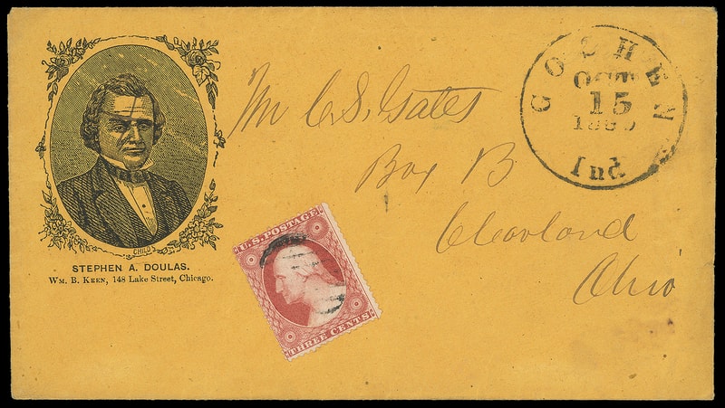 (1860 Campaign) Stephen A. Douglas, oval portrait campaign design in ornate square frame with Wm. B. Keen of Chicago imprint on orange cover bearing 3¢ dull red (26) canceled by grid, matching "Goshen Ind. Oct 15, 1860" cds to Cleveland, Ohio, Very Fine to Extremely Fine.
