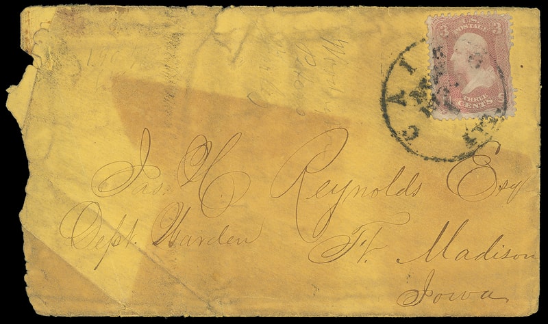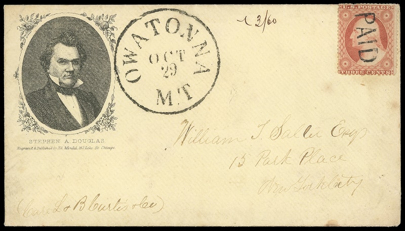 (1860 Campaign) Stephen A. Douglas, oval portrait campaign design in ornate frame on yellow cover bearing 3¢ dull red (26) canceled by sharp "Paid" straightline, matching gem strike "Owatonna, M.T. Oct 29" cds to New York City, original 1860 enclosed letter mentioning envelope " …I will send you an Envelope of my Favorite for the Presidency… "; 3¢ small flaws at top from edge placement, an Extremely Fine and scarce Montana Territorial campaign use.