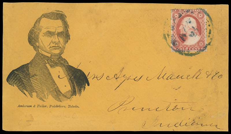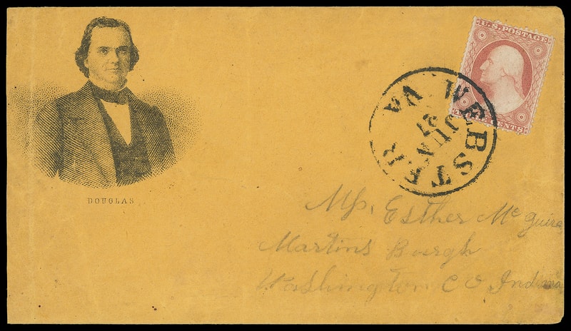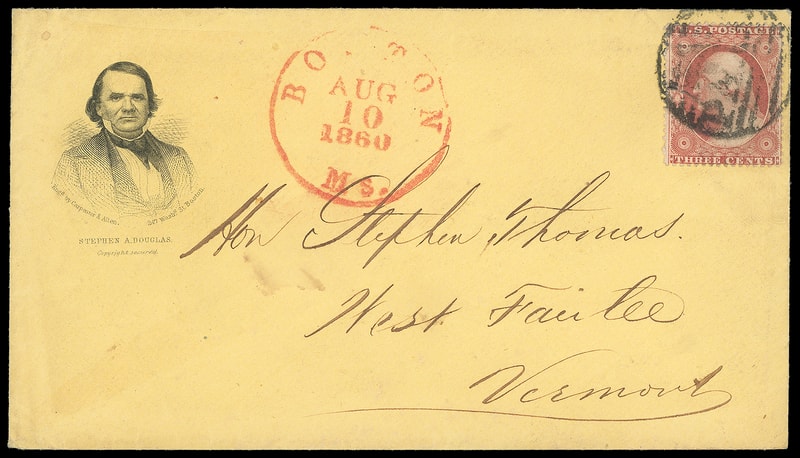 (1860 Campaign) Stephen A. Douglas, engraved portrait campaign design with "Stephen A. Douglas" caption and "Engraved Carpenter & Allan…Boston" imprint on bright yellow cover bearing 3¢ dull red (26) tied by large Boston "Paid" grid, red "Boston Ms. Aug 10, 1860" cds to W. Fairlee Vt., Very Fine and attractive.