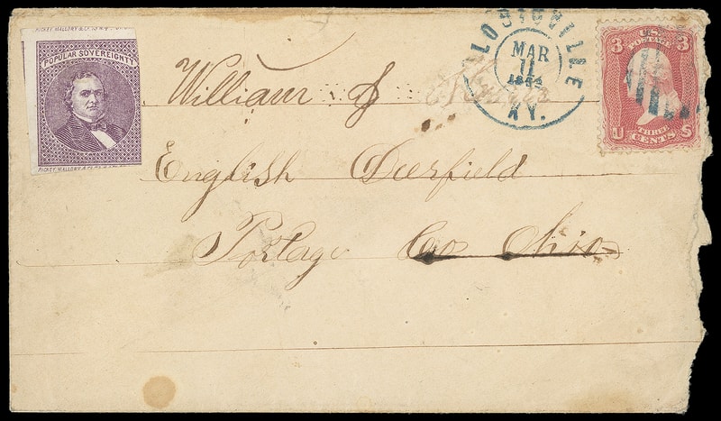 (1860 Campaign) Stephen A. Douglas, purple campaign label on cover bearing 3¢ rose (65) canceled by blue grid duplexed "Louisville Ky. Mar 11, 1864" cds to Deerfield, Ohio; stain spot, roughly opened at right, scarce and Fine appearance.