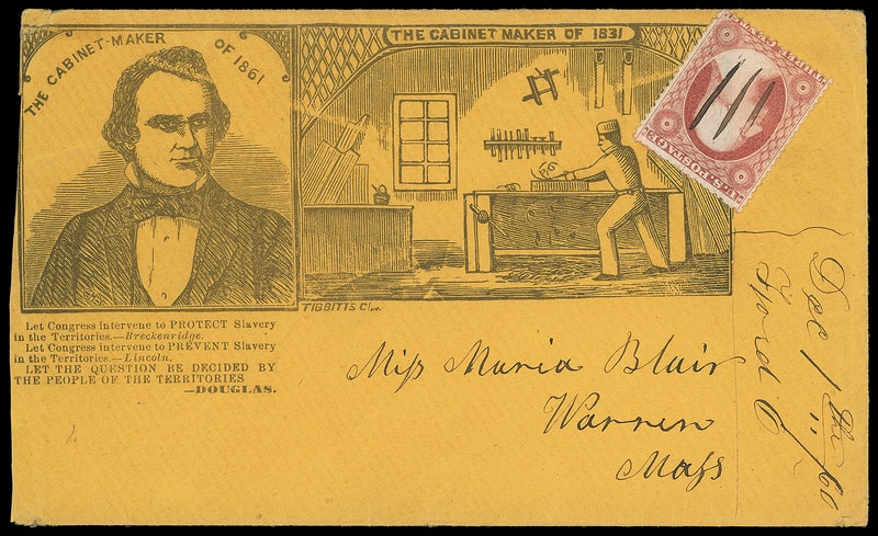 (1860 Campaign) Stephen Douglas "The Cabinet Maker of 1861", large illustrated campaign design featuring portrait of Douglas facing right, verse below and illustration of cabinet maker at right, Tibbetts of Cleveland imprint, on orange cover bearing 3¢ dull red (26) manuscript canceled, matching ms. "Dec 1st "60, Flora O." postmark vertically at lower right to Warren Mass.; reduced at left, 3¢ corner crease, otherwise Very Fine and exceedingly rare design.