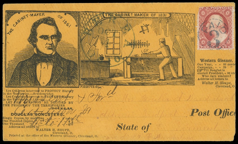 (1860 Campaign) Stephen Douglas "The Cabinet Maker of 1861", large illustrated campaign design featuring portrait of Douglas facing right, verses below including "Douglas Songsters" and illustration of cabinet maker at right, Tibbitts and Western Gleaner of Cleveland imprints, on orange cover bearing 3¢ dull red (26) canceled by blue " Paid 3 " in Circle cancel, matching "Berea, Ohio Oct 4" cds to Bridport Vt., missent and forwarded with manuscript " Missent & Ford, Addison Vt. Octo. 11th " postmark due to address mentioning Addison, which was the county; reduced slightly at right, 3¢ corner flaw, still Very Fine and wonderful campaign design.