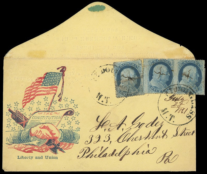 (1860 Campaign) Stephen A. Douglas, H.V. Johnson, blind embossed campaign design on front and flap of patriotic cover with red and blue Flag, Constitution and Hands, additional verse "Liberty and Union" below, on yellow cover bearing three 1¢ blue (22 large break at top, 24, 24) singles, tied by two strikes of "Pt. Douglas M.T." cds, one with ms. "July 28, 1861" dating to Philadelphia Pa.; stamp faults, scarce combination and territorial usage, F.-V.F. appearance and scarce Minnesota Territory campaign use.