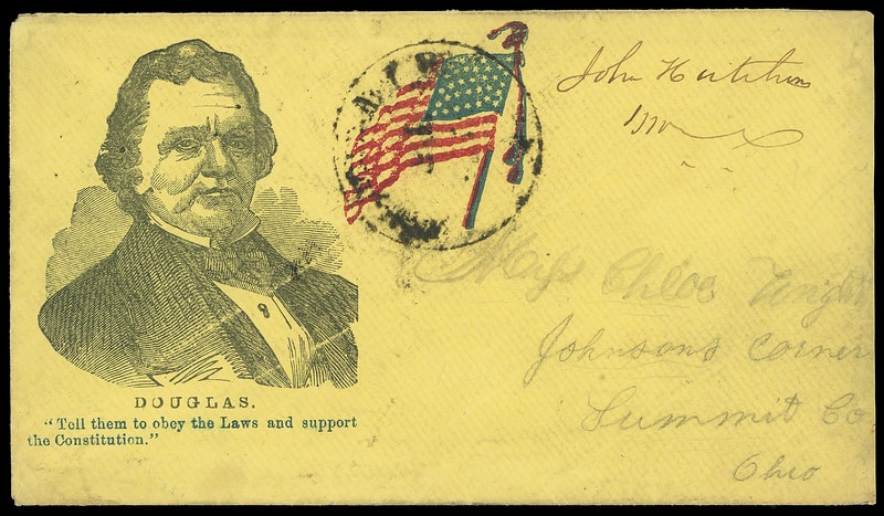 (1860 Campaign) Stephen A. Douglas, patriotic campaign design with large portrait with verse "Tell them to obey the law and support the Constitution" below and additional red and blue patriotic flag design at center on yellow cover bearing " John Hutchins, M.C. " Congressional free frank to Johnsons Corner, Ohio; barely reduced at right, F.-V.F. and scarce patriotic campaign design.