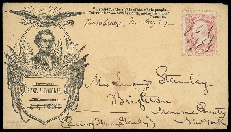 (1860 Campaign) Stephen A. Douglas, patriotic campaign design with portrait surrounded by eagle and flags with verse to right at top, on buff cover bearing 3¢ rose (65) canceled by manuscript squiggles, matching " Trowbridge Mi. Aug 27 " Michigan postmark to Brighton N.Y., manuscript obliterated "President, H.T. Johnson Vice President" suggests post-election use, Very Fine.