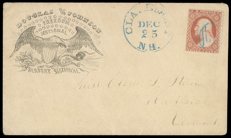 (1860 Campaign) Stephen A. Douglas, H.V. Johnson, patriotic campaign design featuring Eagle, Shield and Serpent "Douglas & Johnson, Freedom, National, Slavery Sectional" slogans on fresh cover bearing 3¢ dull rose (26) canceled by partial blue circular grid, matching "Clarendon N.H. Dec 25" Christmas Day cds to Hartland, Vermont, Extremely Fine and choice, a rare design.