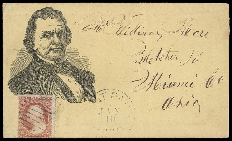 (1860 Campaign) Stephen A. Douglas, large black portrait campaign design on buff cover bearing 3¢ dull red (26) canceled by open grid, indistinct "Saint Paul, Ohio, Jan 10" cds to Fletcher, Ohio, 3¢ small flaws and tied by light soiling, reduced slightly at right; accompanied by unoriginal matching campaign lettersheet with "Squatter Sovereignty" caption and datelined "Pontiac Sept. 13th, 60", some cross writing at top, F.-V.F. pair.