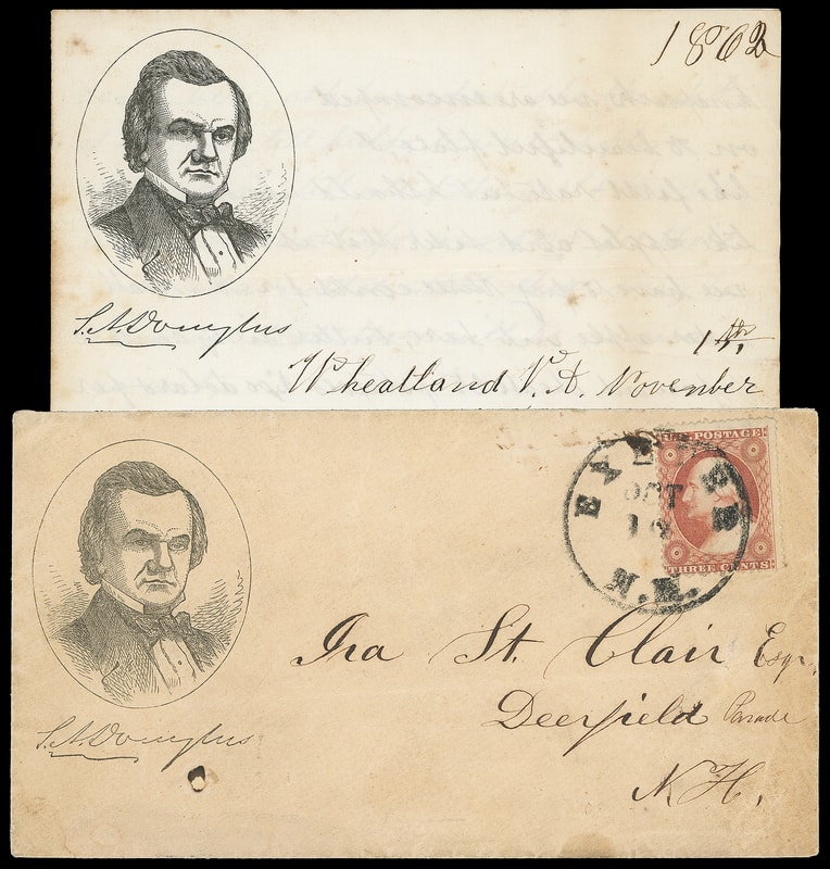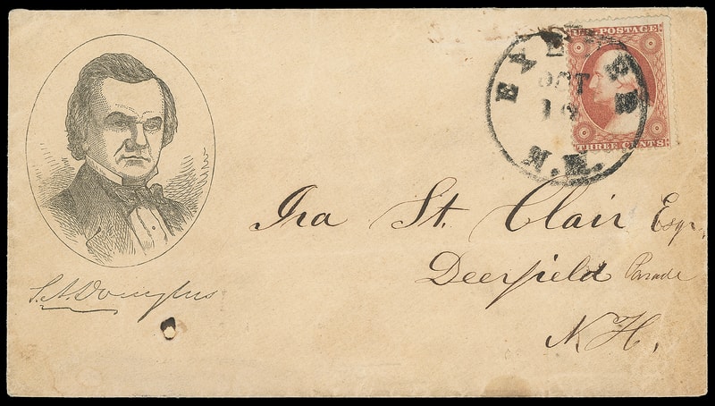 (1860 Campaign) Stephen A. Douglas, campaign design with portrait in oval and printed facsimile signature below on buff cover bearing 3¢ dull red (26) tied by "Exeter N.H. Oct 18" cds to Deerfield N.H.; small ink erosion spot; accompanied by non-original matching campaign design lettersheet datelined "Wheatland Va. November 1st, 1862" with letter from Civil War soldier "I arrived safe and well, and hope these few lines will find you the same, we are within four miles of the rebels, and expect to fight every day. I think we shall move to day or to morrow, our pickets brought in some rebel cavalry last knight, proberly we shall have to fight soon, but we have good courage yet, we dont fear them,we have plenty of big guns and men…", some light toning, F.-V.F. and scarce pair.