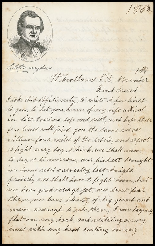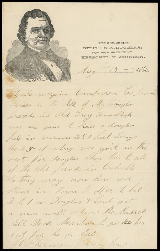 (1860 Campaign) Stephen A. Douglas, small campaign design lettersheet with portrait and "For President, Stephen A. Douglas; For Vice President, Herschel V. Johnson" at right, letter datelined "Aug 15 1860" with great political content " We are goin to raise a douglas pole in Vernon 250 feet long…we go in the West for Douglas show this to all of the Old friends in Coolville so they may now [sic] how we stand in Iowa…I offer to bet 2 to 1 on Douglas…wee dont now Breckenridge in Iowa Lincoln can split rails for the next four years I think hura hura Douglas & Johnson they are the men for me. "; couple trivial tone spots, F.-V.F. and rare.