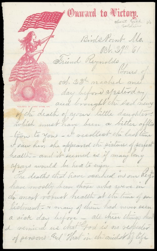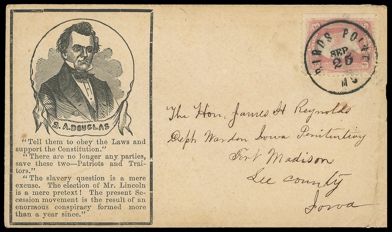 (1860 Campaign) Stephen A. Douglas, campaign design with Douglas portrait in oval frame and outer black frame, excerpts from various speeches, " Tell them to obey the Laws and the Constitution " on buff cover bearing 3¢ rose (65), tied by bold "Bird Point Mo. Sept 26" 1861 cds to Fort Madison Wis., with original Sept. 25th 1861 letter with extensive war news describing troop movements, skirmishes, wounded etc, transcribed; cover reduced slightly at right and bottom corner tear; additional second letter from same correspondence with red patriotic "Onward to Victory" letterhead with Liberty and Flag, F.-V.F., excellent documentation of first hand experiences.