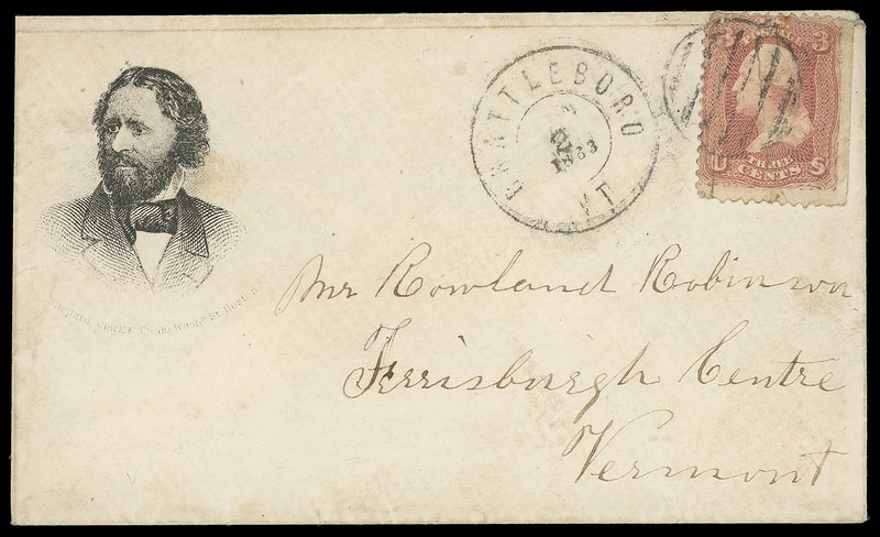 (1864 Campaign) John Fremont, portrait campaign design with "Shepard Clark & Co. 110 Washington St. Boston Mass" imprint below, on small cover bearing 3¢ rose (65) tied by six-bar grid, matching "Brattleboro Vt. 1863" cds to Ferrisburgh Centre Vt.; some wear, 3¢ faults, F.-V.F. appearance.