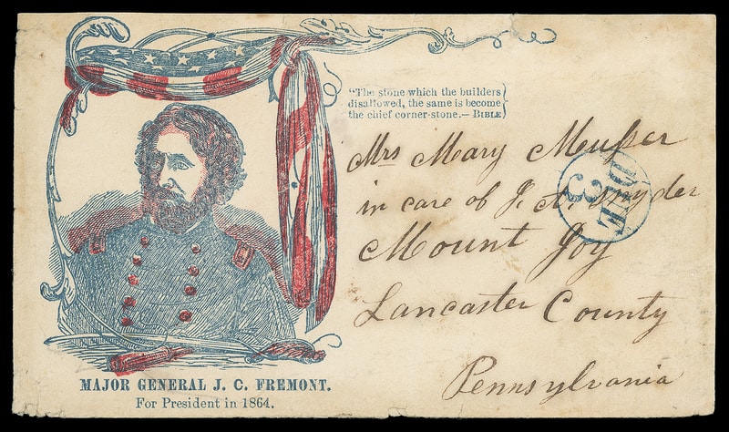 (1864 Campaign) John Fremont, red and blue patriotic campaign design with "Major General J.C. Fremont For President in 1864" caption and verse on cover with Baltimore blue "Due 3" in circle rating handstamp to Mount Joy Pa.; cover edge flaws and light cleaning, F.-V.F. appearance, a scarce patriotic campaign design.