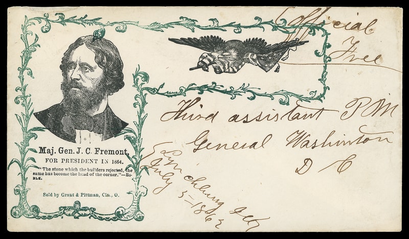 (1864 Campaign) John Fremont, black portrait design with additional eagle and flags, "Maj. Gen. J.C. Fremont for President in 1864" caption, all in an intricate green frame on cover with manuscript "Lynchburg, Ill. July 5 - 1862" postmark and "Official Free" rating addressed to the Third Assistant Postmaster General, Washington D.C.; partial flap with small top left edge mend, Extremely Fine, ex-Gabriel .