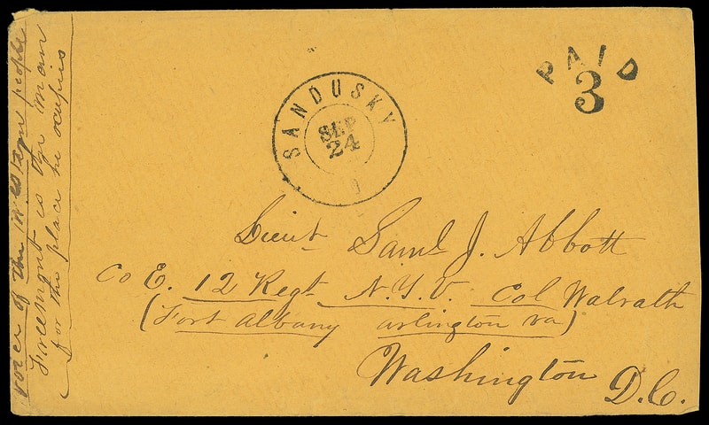 (1864 Campaign) John Fremont, unofficial campaign cover with vertical manuscript " Voice of the Western people, Freemont is the man for this place he occupies " at left on orange cover with "Sandusky O. Sep 24" cds with matching bold arc "Paid 3" and "Sandusky, O. Sep 24" dcds with military address to Lieut. Samuel J. Abbott, Co. E. 12th Regt. N.Y.V. Col Walrath (Fort Albany, Arlington Va.) Washington, DC, additional manuscript on reverse " Come away with honor, Keep to your Post "; reduced at right, Very Fine.