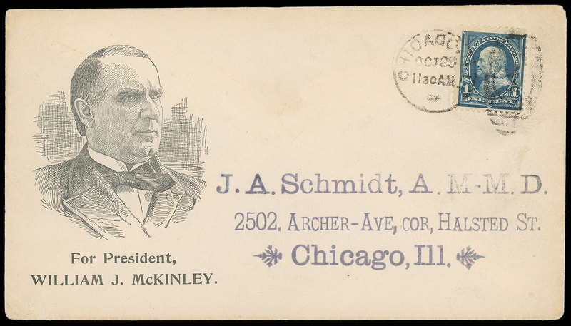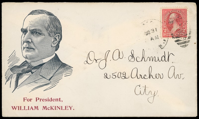 (1896 Campaign) William J. McKinley, campaign design with large engraved portrait and with red "For President…" below on light buff cover bearing 2¢ carmine (267) tied by partial "Chicago Ill. Station J, Aug 31" cds duplex to local street address, "Chicago, Ill. Station W, Aug 31" arrival backstamp, impressive and attractive, Extremely Fine, unlisted in Milgram Presidential Campaigns similar type page 259.