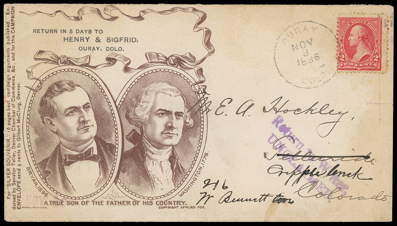 (1896 Campaign) William J. Bryan, brown campaign design with dual portraits in ornate frames of Bryan and George Washington with ribbon above and verse below "A True Son Of The Father Of His Country", additional vertical advertising at left offering literature and overall campaign literature and speeches on reverse, on forwarded cover bearing 2¢ carmine (267) tied by "Ouray Colo. Nov 16, 1896" cds to Telleride Col., purple "Return to Writer, Unclaimed" two-line handstamp; cover tear at right and light toning, F.-V.F.