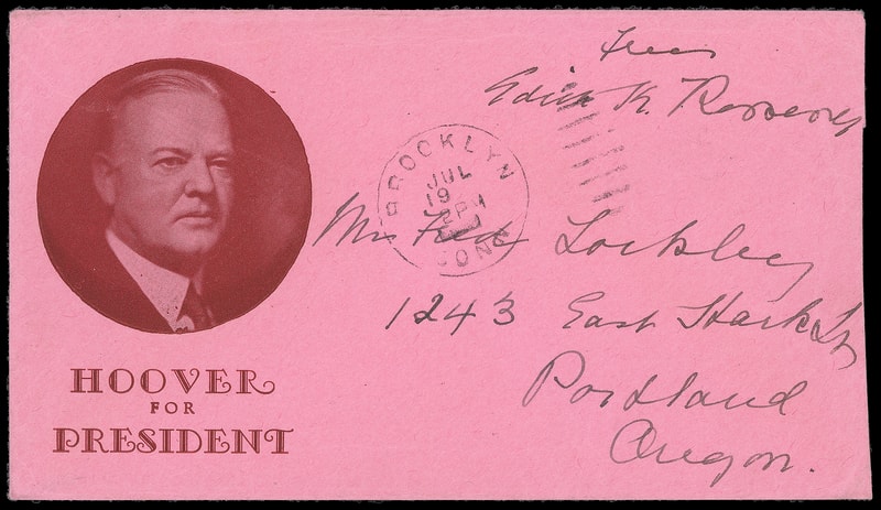 (1932 Campaign) Herbert Hoover, dark red campaign design with portrait in circle and "Hoover for President" camption below on pink cover with "Edith Roosevelt" free frank and "Brooklyn, Conn. Jul 19" duplex to Portland, Oregon; reduced slightly at right, fresh and Extremely Fine.