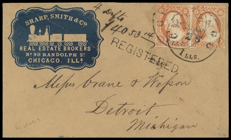 Chicago, Ill. "Registered", straightline, matching two strikes of "Chicago Ills. May 26" cds tie 3¢ dull red (11A) horizontal pair , positions 68-69L3, margins to in, on buff cover with blue "Sharp, Smith & Co., Real Estate Brokers, Chicago, Ills." illustrated cameo corner card showing steam engine train to Detroit, Mich., docketed as containing 4 drafts totaling $4053.14, Very Fine and choice Chicago registered cover, the earliest recorded Chicago registered cover .