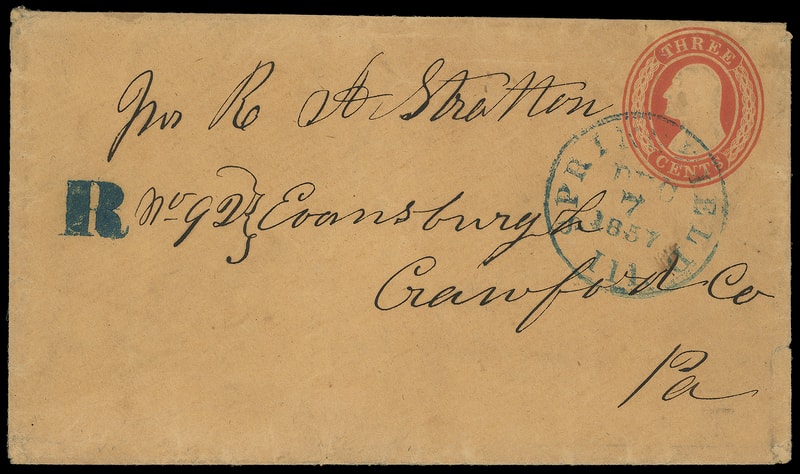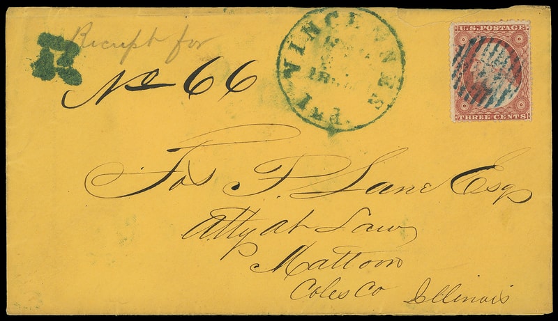 Vincennes, Ind. "R", overinked blue handstamp with ms. "No 66" registry number, matching partial "Vincennes Ind. Sep 20, 1860" cds and blue grid canceling 3¢ dull red (26) on orange cover to Mattoon Ill., pencil "Receipt for" notation, original letter indicating $6 enclosed; top edge mend, F.-V.F. appearance, the only recorded example .