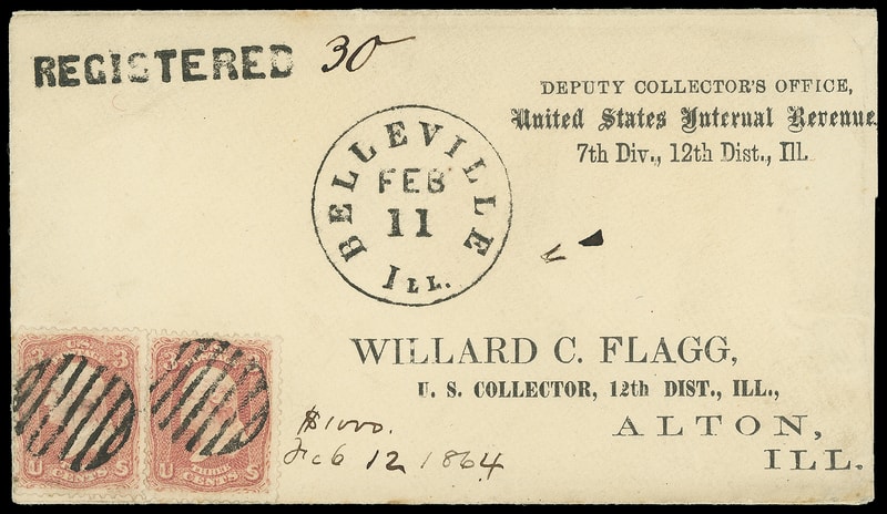 Belleville Ill. "Registered", black 41mm straightline with ms. "30" registry number, matching sharp "Belleville Ill. Feb 11" cds and open circular grids cancel two 3¢ rose (65) singles on buff United States Internal Revenue imprint cover to Alton Ill., ms. "$1000, Feb 12, 1864" receipt docketing at bottom; reduced slightly at right, Very Fine and choice strikes.