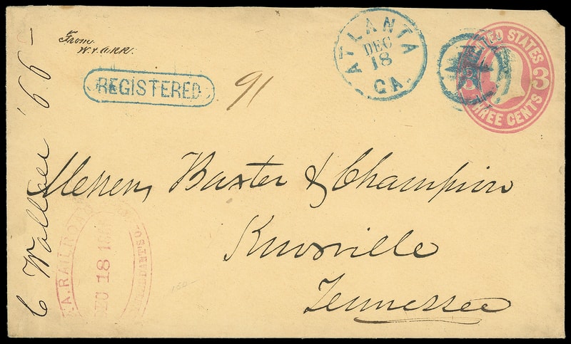 Atlanta Ga. "Registered", blue oval framed handstamp with ms. "91" registry number, matching "Atlanta Ga. Dec 18" cds duplexed with encircled star fancy cancel on 3¢ pink (U59) buff entire to Knoxville Tenn., 1866 docketing at left; upper right corner clipped, Very Fine and rare Atlanta registry use.