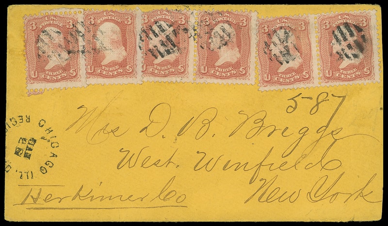 Chicago, Registered, Jan 26, rimless cds and manuscript "587" registry number, matching circular grid cancels tie 3¢ red, F grill (94) , two singles and two pairs, on 1869 orange cover to New York City, 1869 enclosure for doll order; reduced slightly at right, one 3¢ faults, Very Fine and early 15¢ registry rate use.