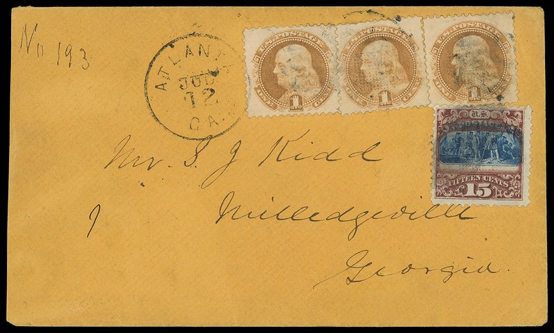 Atlanta, Ga., ms. "No 193" registry number, "Atlanta Ga. Jul 12" cds duplexed with cork cancel that tie or cancel three well-centered 1¢ buff (112) singles and 15¢ brown & blue, type II (119) with dramatic misalignment of vignette and frame, on 1869 registered buff cover to Millidgeville Ga.; slightly reduced at left, Very Fine and extremely rare use of three 1¢ 1869s for the postage, ex-Gibson, Coulter .