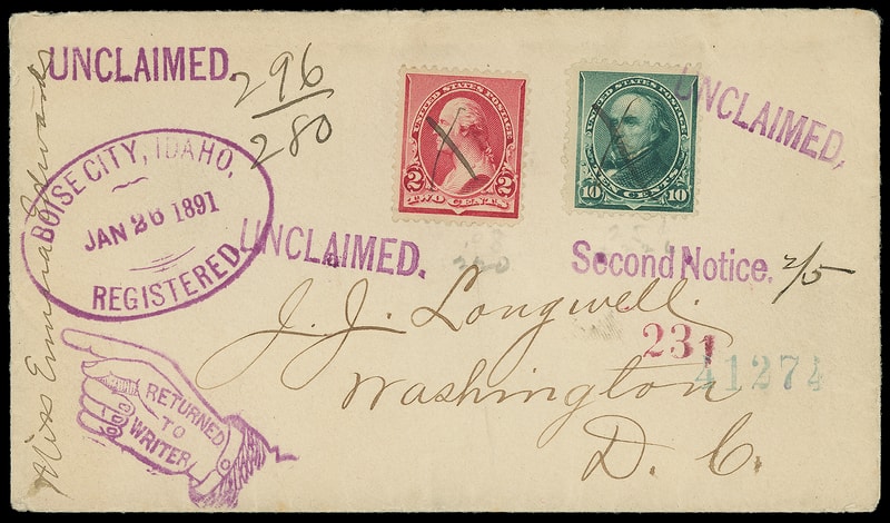 Boise City, Idaho, Registered. Jan 26 1891, bold purple oval datestamp on cover bearing neatly pen canceled 2¢ carmine (220) and 10¢ green (226) , matching "296/280" registry numbers to Washington D.C., purple "Unclaimed." handstamps and "Second Notice" along with "Returned to Sender" hand handstamp, fresh and Very Fine territorial registered use.