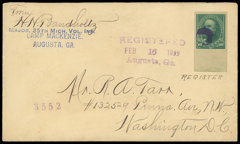 Registered, Feb 16 1899, Augusta, Ga., three-line postmark on amber cover bearing 10¢ green (258a) imperf bottom sheet margin single canceled by small cork sent from Maj. Bandholtz, blue "Major, 35th Mich. Vol. Ind., Camp MacKenzie, Augusta. Ga." h.s., Washington D.C. (2.19) arrival backstamp, Very Fine and rare imperforate use; signed Bartels.