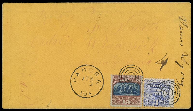 Panora, Iowa, orange cover bearing 3¢ ultramarine (114) and 15¢ brown & blue (119) , each tied by sharp four-ring cancel duplexed with "Panora Ioa. Apr 10" cds, ms. "4" registry number to Castalia, Iowa, 1870 original letter; flap torn, 3¢ small tear, Very Fine use.