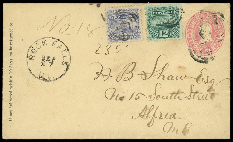 Rock Falls Ill. "No. 22", manuscript registry number on 3¢ pink (U59) buff entire bearing 1869, 3¢ ultramarine (114) and 12¢ green (117) , each tied by partial four-ring target, matching "Rock Falls, Ill. Sep 27" cds from the H.B. Shaw correspondence to Alfred Me., return receipt label, Very Fine.