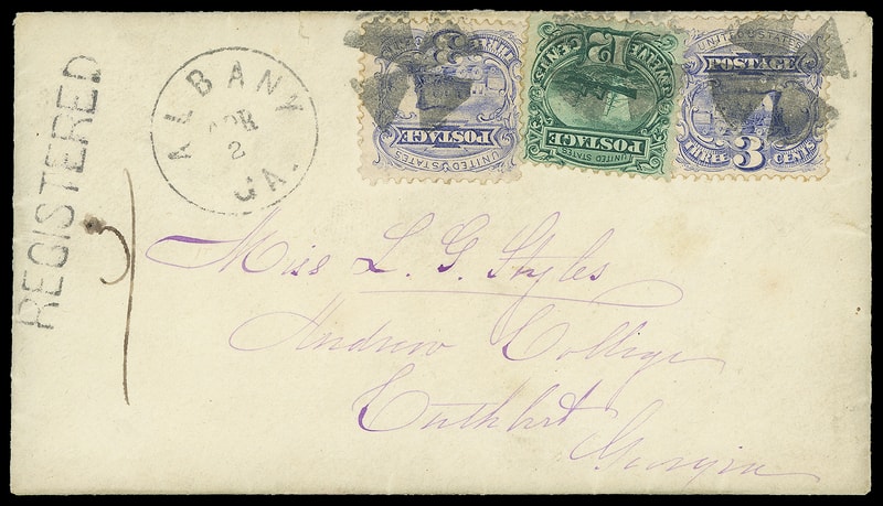 Albany Ga. "Registered", straightline with ms. "3" number, matching "Albany Ga. Apr 2" cds duplexed with fancy cross cancels tying two 3¢ ultramarine (114) singles, 12¢ green (117) on 1870 cover to Cuthbert Ga., original 1870 enclosed letter; flap torn, 12¢ corner crease, Very Fine and attractive 1869 Issue Georgia registered use, only two recorded .
