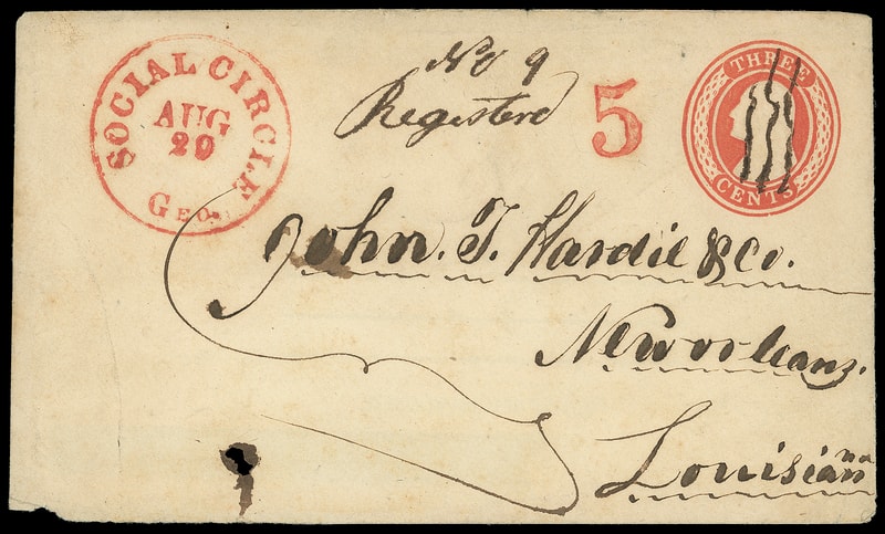 Social Circle Geo. "No 9, Registered", manuscript notation, red "Social Circle, Geo. Aug 29" cds with matching "5" rating handstamp on 3¢ red (U9) Nesbitt entire manuscript canceled to New Orleans La.; bottom flap missing, Very Fine and rare example showing registry fee paid in cash.