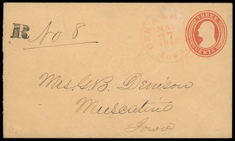 Oskaloosa, Iowa "R", bold handstamp with ms. "No 8" number, red "Oskaloosa, Iowa May 27, 1859" cds cancels 3¢ red (U10) buff Nesbitt entire to Muscatine, Iowa, Very Fine and unique.