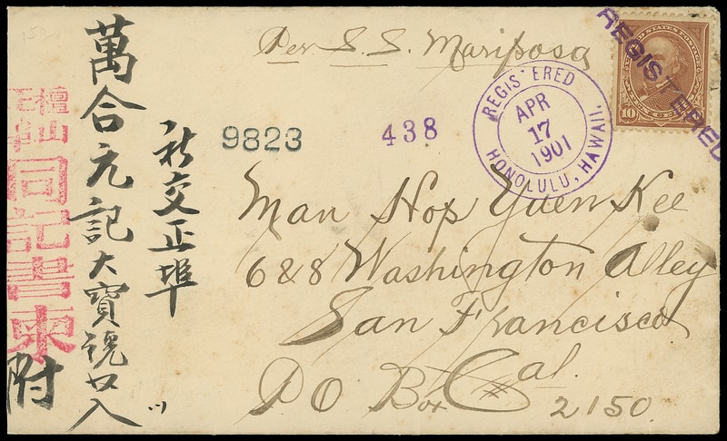 Honolulu, Hawaii Territory, light buff cover bearing 10¢ orange brown (283) tied by purple "Registered" straightline and "Honolulu, Hawaii, Registered, Apr 17 1901" cds to San Francisco Cal., endorsed " Per S.S. Mariposa " at top, purple San Francisco (4.24) arrival backstamp; reduced slightly at left, Very Fine and early Hawaii Territory registered use.
