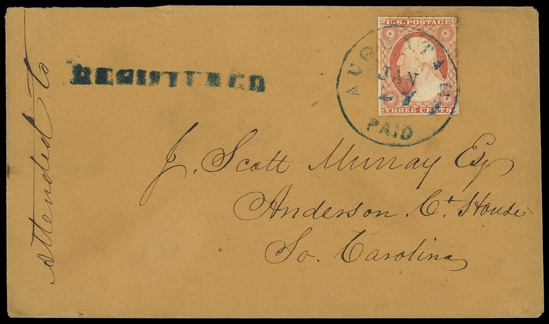 Augusta Ga. "Registered", blue 5 x 50mm straightline, matching "Augusta Ga., Paid, Jan 27" cds ties 3¢ dull red (11A) , three margins, on buff cover to Anderson C.H., S.C., Very Fine, only recorded example .