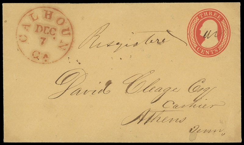 Calhoun Ga. "Registered", manuscript postmark on 3¢ red (U10) buff entire with red "Calhoun Ga. Dec 7" cds to Athens Tenn.; flap torn with bit missing, Very Fine.