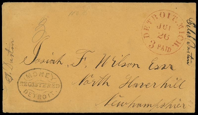 Detroit, Michigan "Money, Registered, Detroit", fancy oval handstamp on orange cover with red "Detroit, Mich. '3 Paid' Jul 26" integral-rate cds to North Haverhill N.H., pencil "100$" notation at top; reduced slightly at left with bit of paper loss, Very Fine.