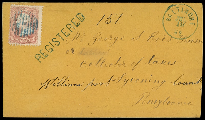 Baltimore, Md. "Registered", blue 34mm straightline with ms. "151" registry number, matching blue "Baltimore Md. Jul 18" cds and open circular grid cancels 3¢ rose (65) on orange cover to Williamsport Pa.; reduced slightly at right, Very Fine and scarcer blue strike.