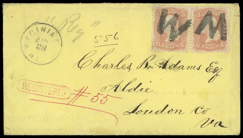 Virginia City, Nevada "Registered", red oval framed handstamp with red ms. "#55" registry number, on homemade yellow cover bearing two 3¢ rose (65) singles, each canceled by bold " W " fancy cancels, matching "Virginia City, Nev. Apr 28" cds to Aldie Va., pencil "Reg"; left 3¢ corner corner creases, Very Fine and unusual Western registered use.